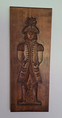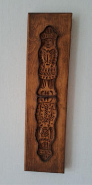 Buchenholz geschnitzt. Im Unterschied zu Spekulatiusformen ist der Printenteig sehr hart. Nach dem Einpressen in die Form