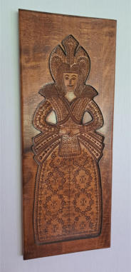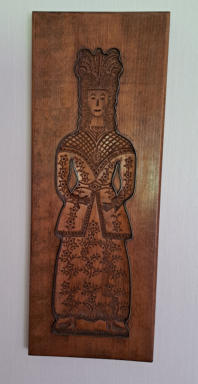 Buchenholz geschnitzt. Im Unterschied zu Spekulatiusformen ist der Printenteig sehr hart. Nach dem Einpressen in die Form